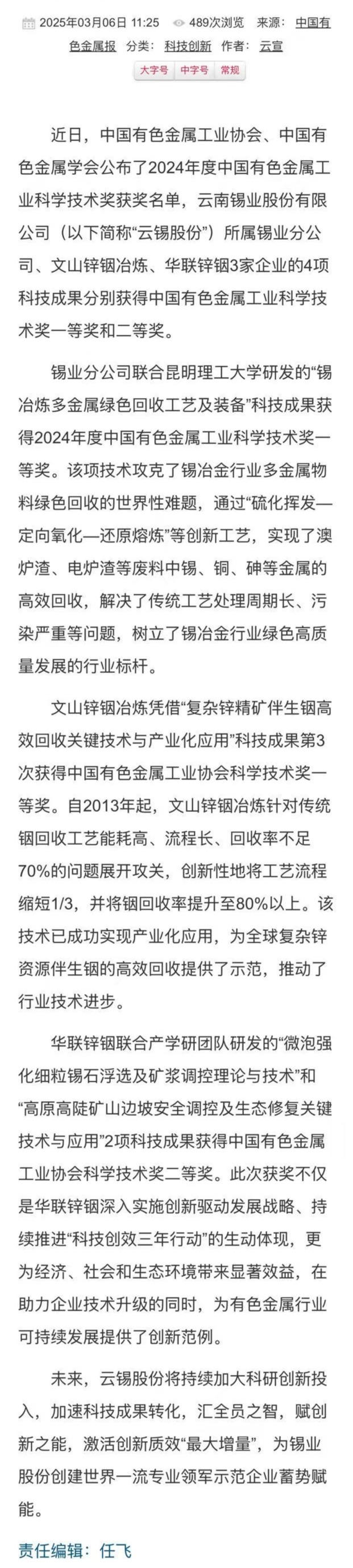 中國有色金屬報:云錫股份所屬企業4項科技成果獲2024年度中國有色金屬工業科學技術獎