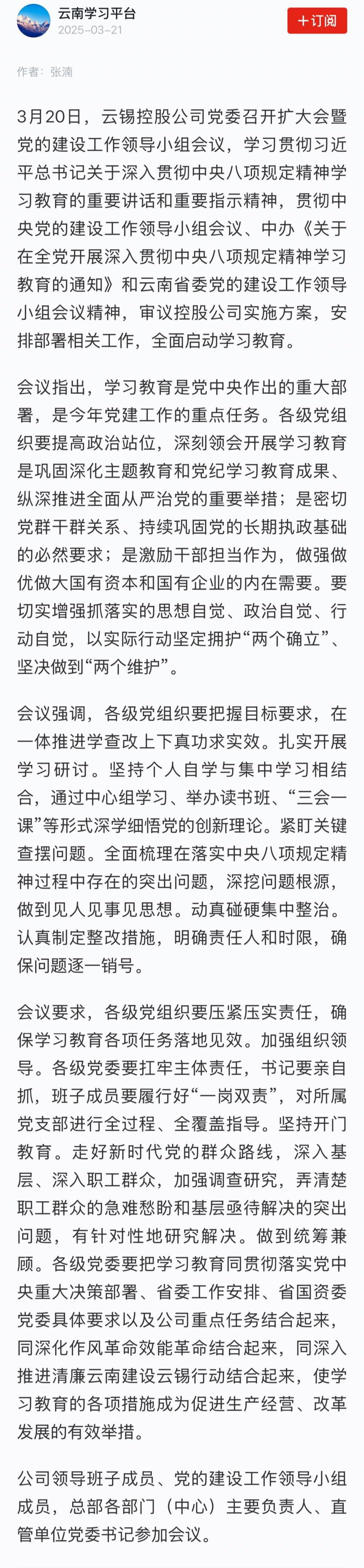 學習強國:云錫控股公司黨委安排部署深入貫徹中央八項規定精神學習教育