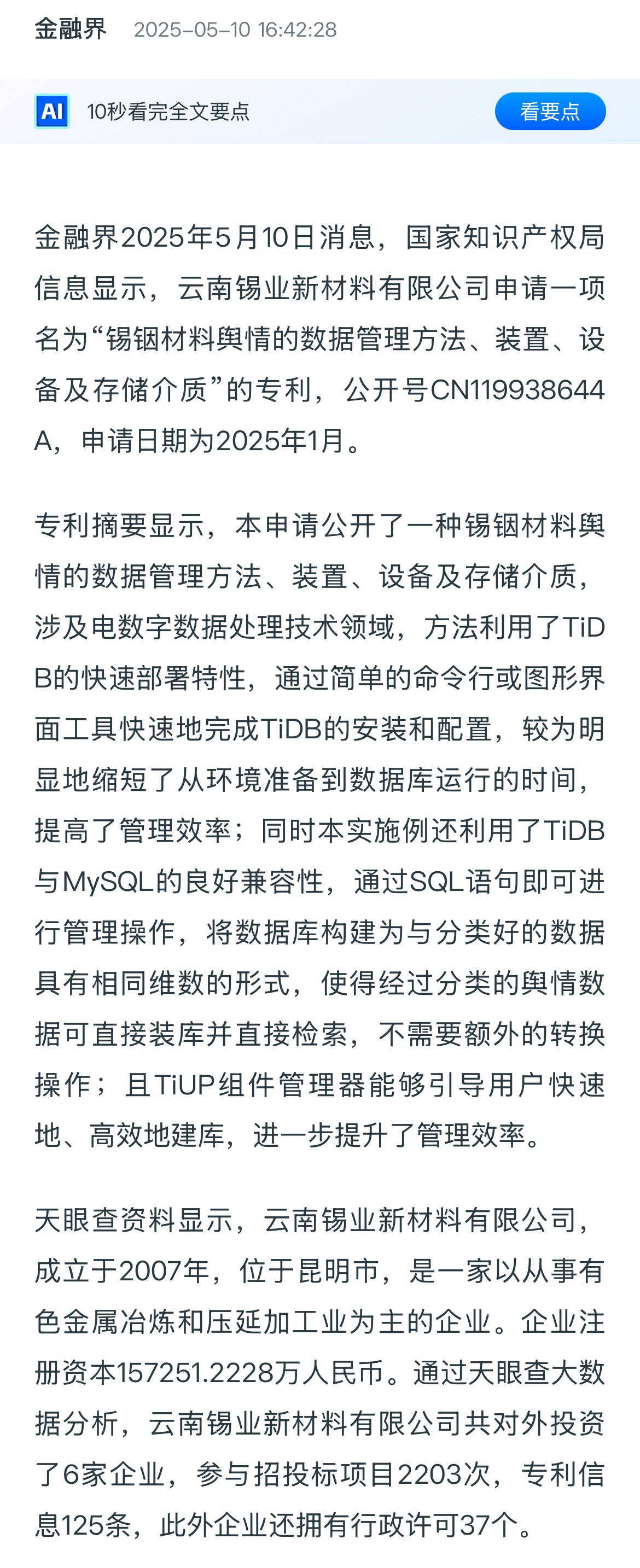 金融界:云南錫業新材料申請錫銦材料輿情數據管理專利,提高管理效率