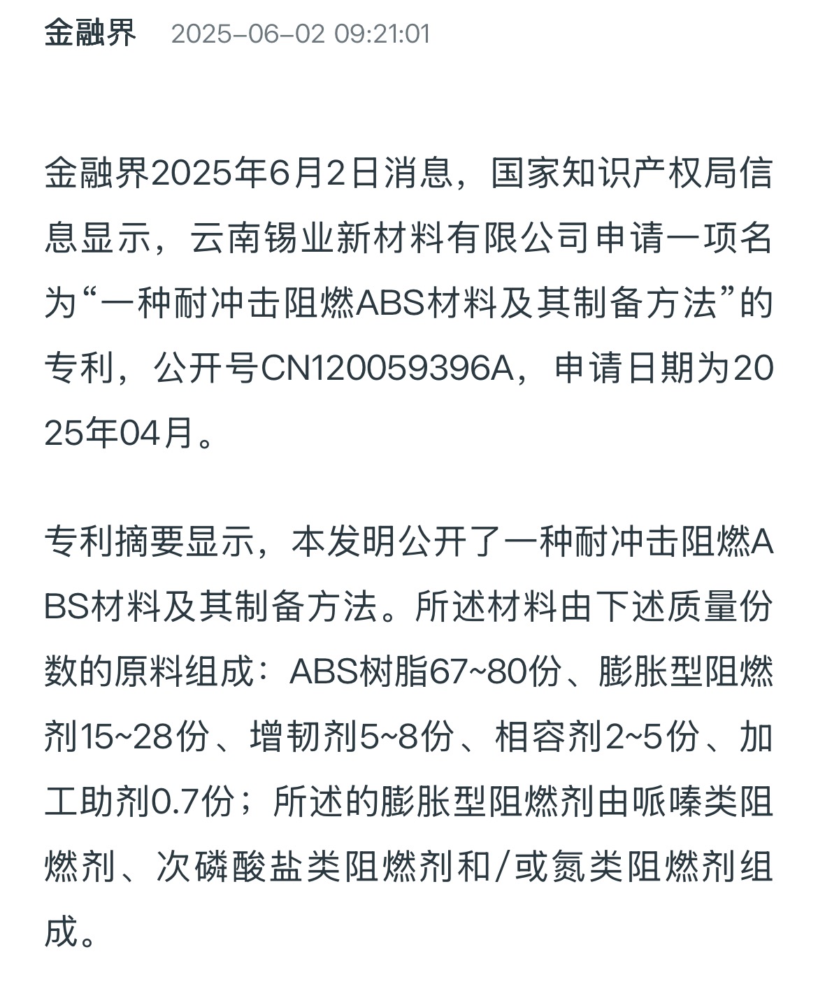 金融界:云南錫業新材料申請耐沖擊阻燃ABS材料及其制備方法專利,具備優異的力學性能和阻燃性能