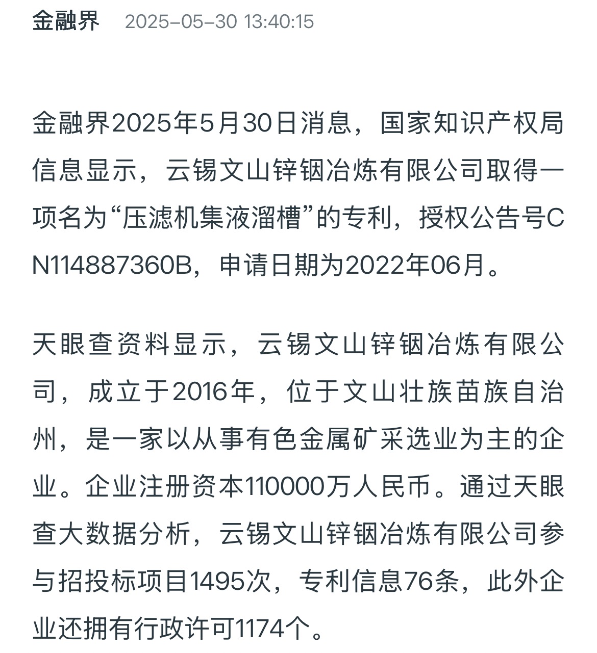 金融界:云錫文山鋅銦冶煉取得壓濾機集液溜槽專利