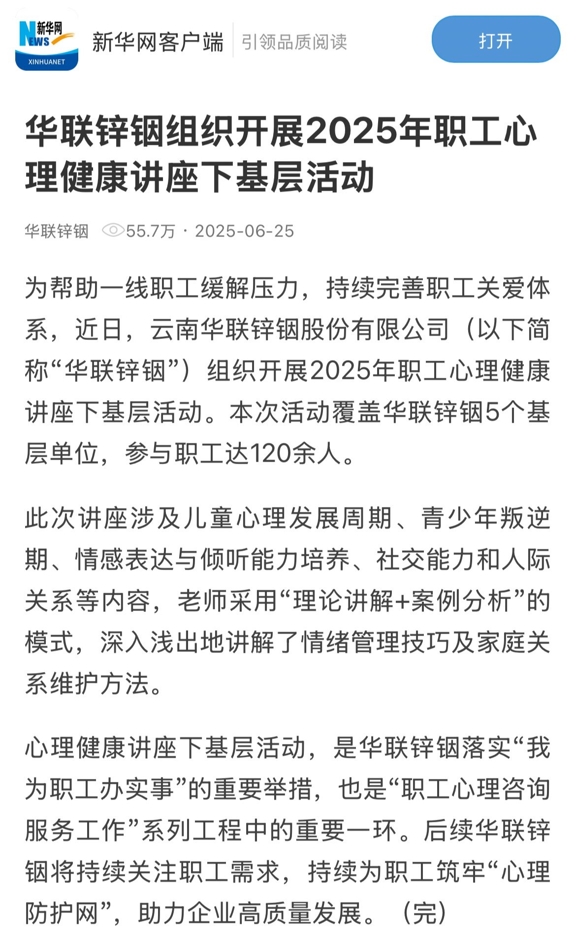 新華網:華聯鋅銦組織開展2025年職工心理健康講座下基層活動